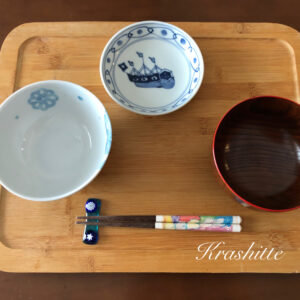 - 手前にお箸をお箸置きにセットし、左に飯碗、右に汁椀、中央に香の物を置きます。これが和のセッティングの基本となる一汁一菜の形です。